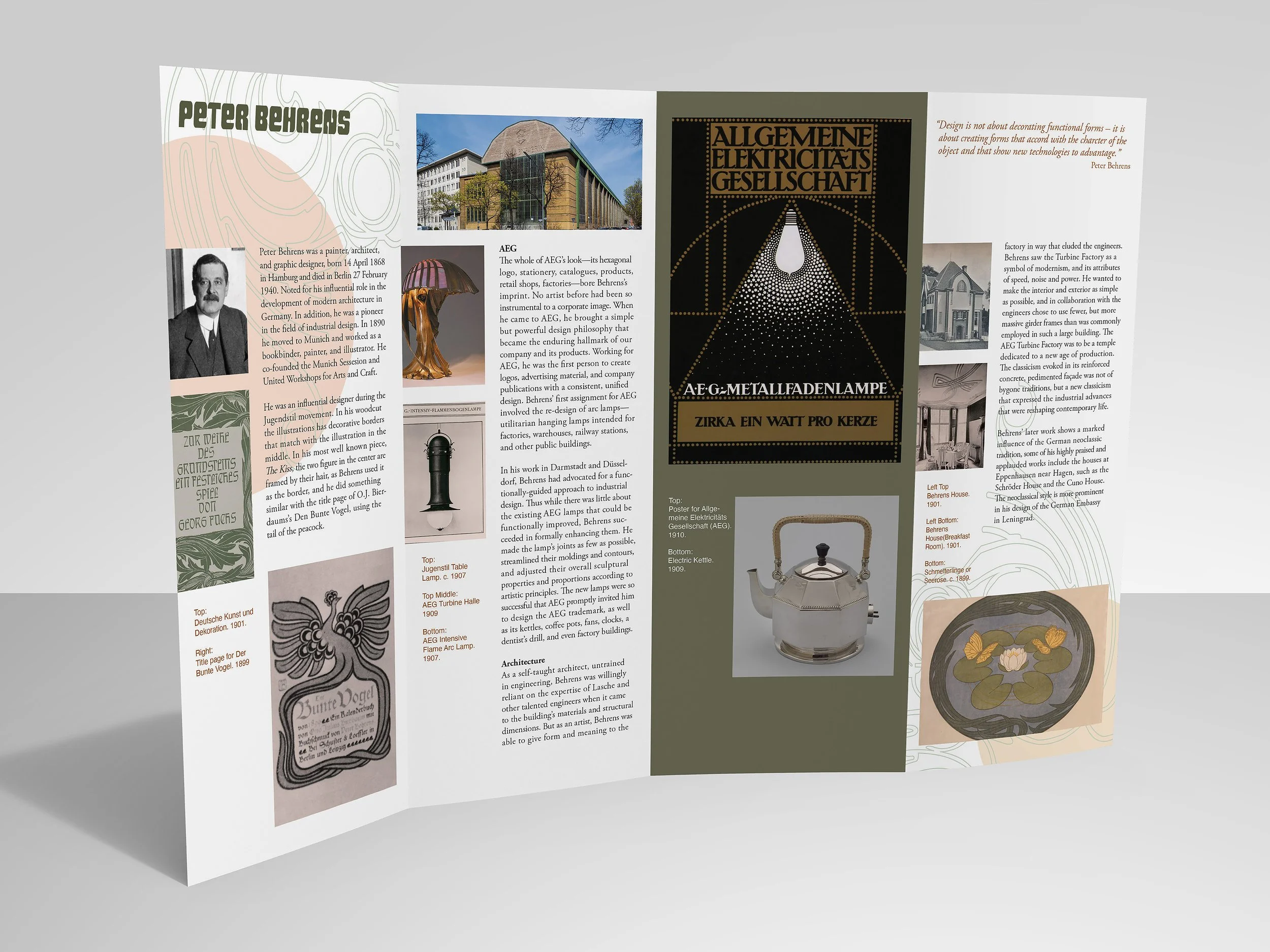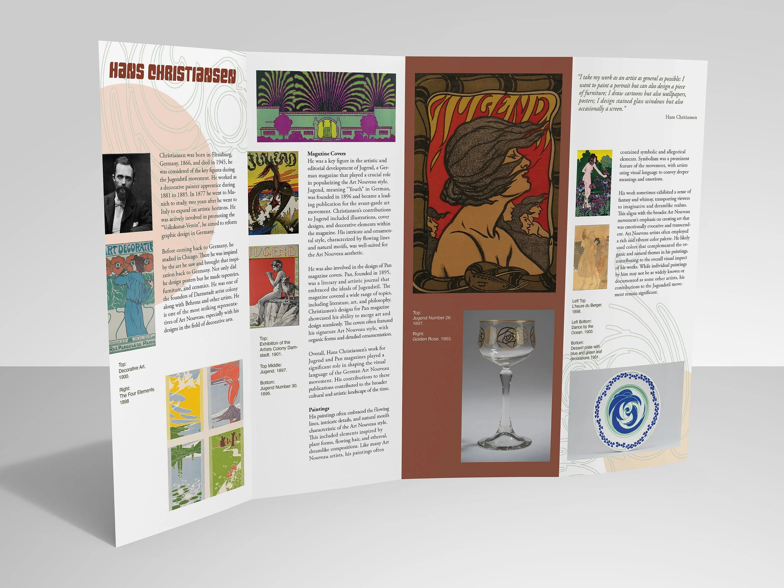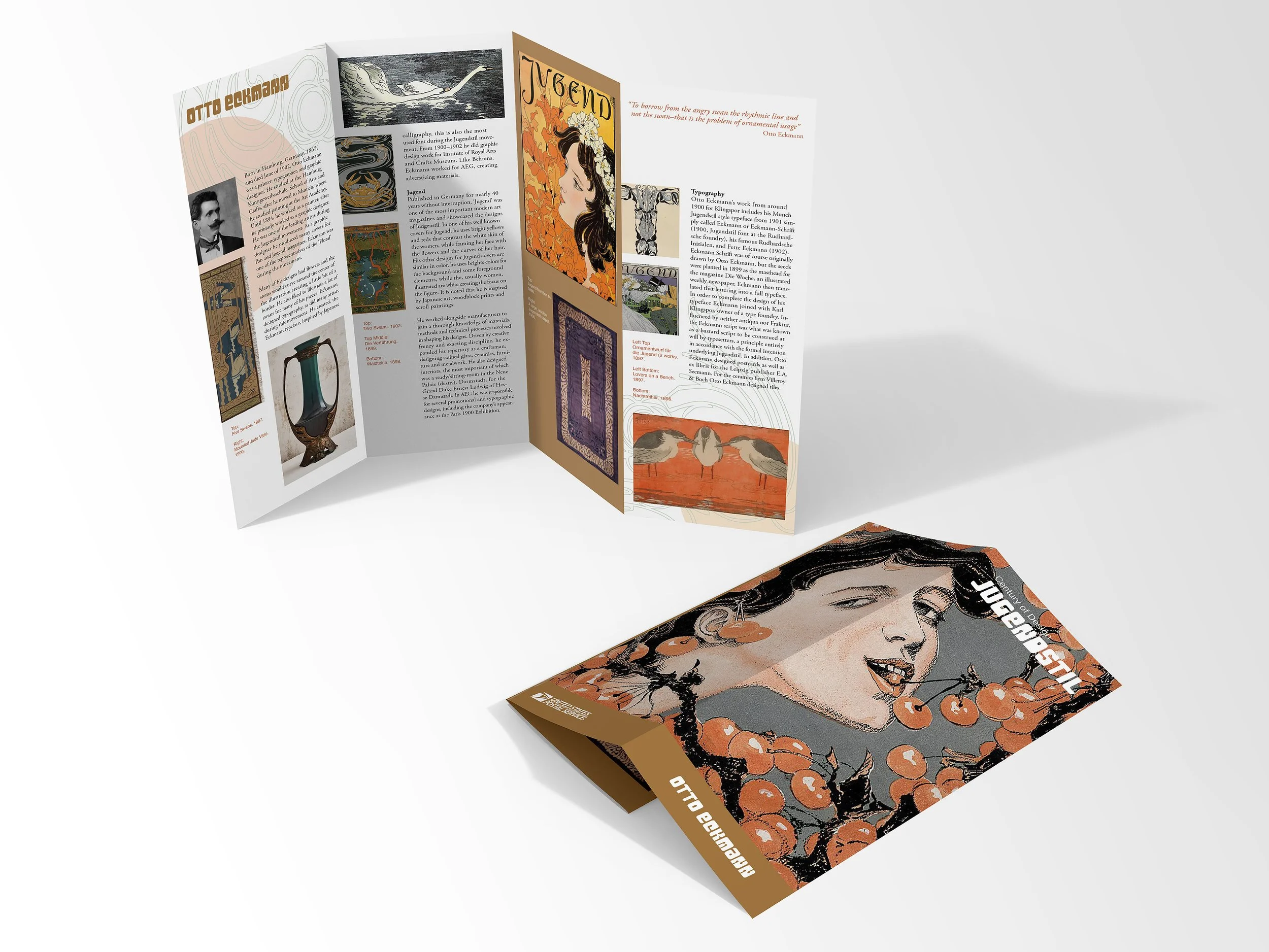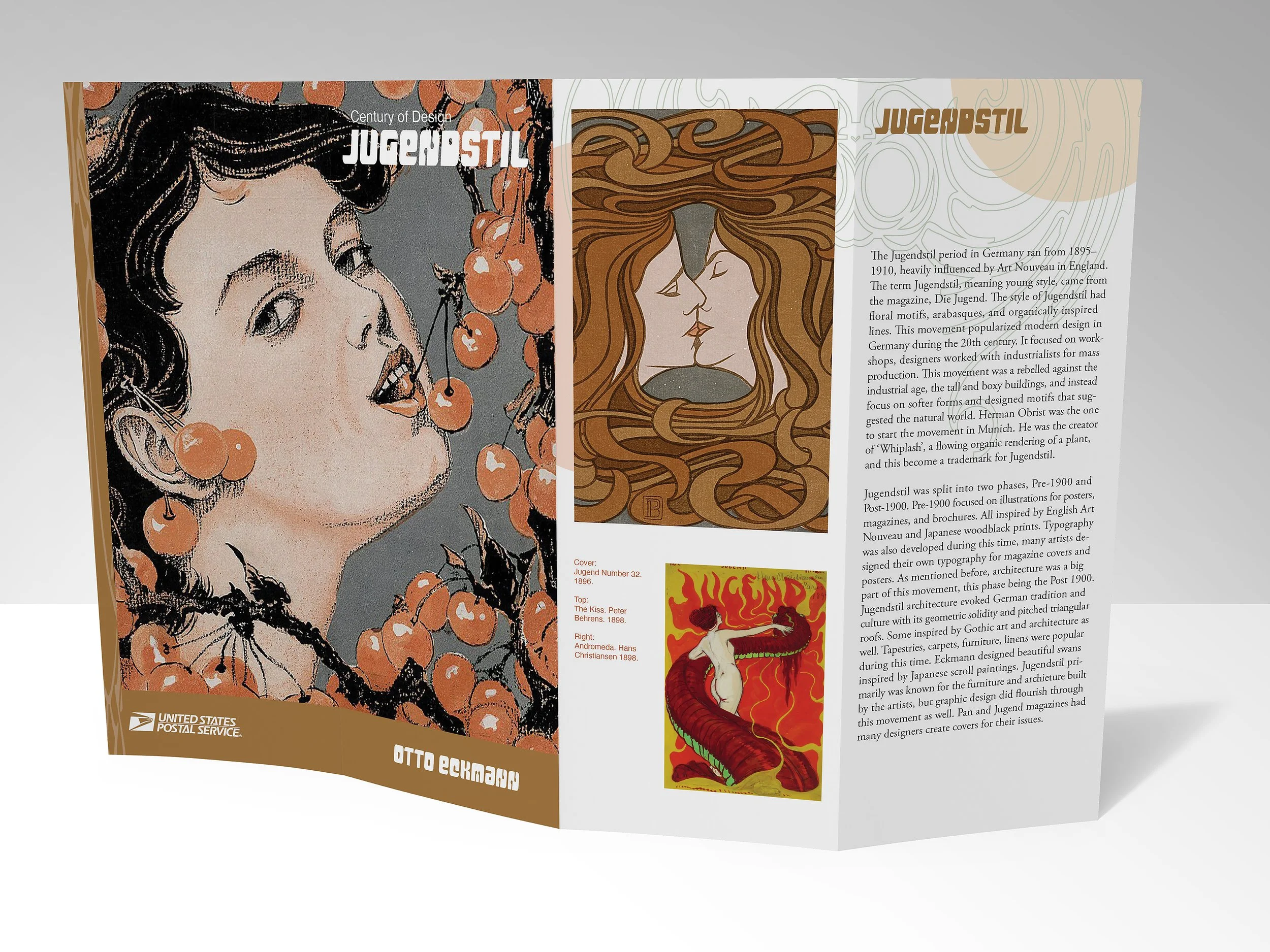Researching a design movement and creating a stamp sheet and brochures for it. Jugendstil was a short design movement from Germany and had talented artists like Peter Behrens. Designed a system for the whole stationery to work together.